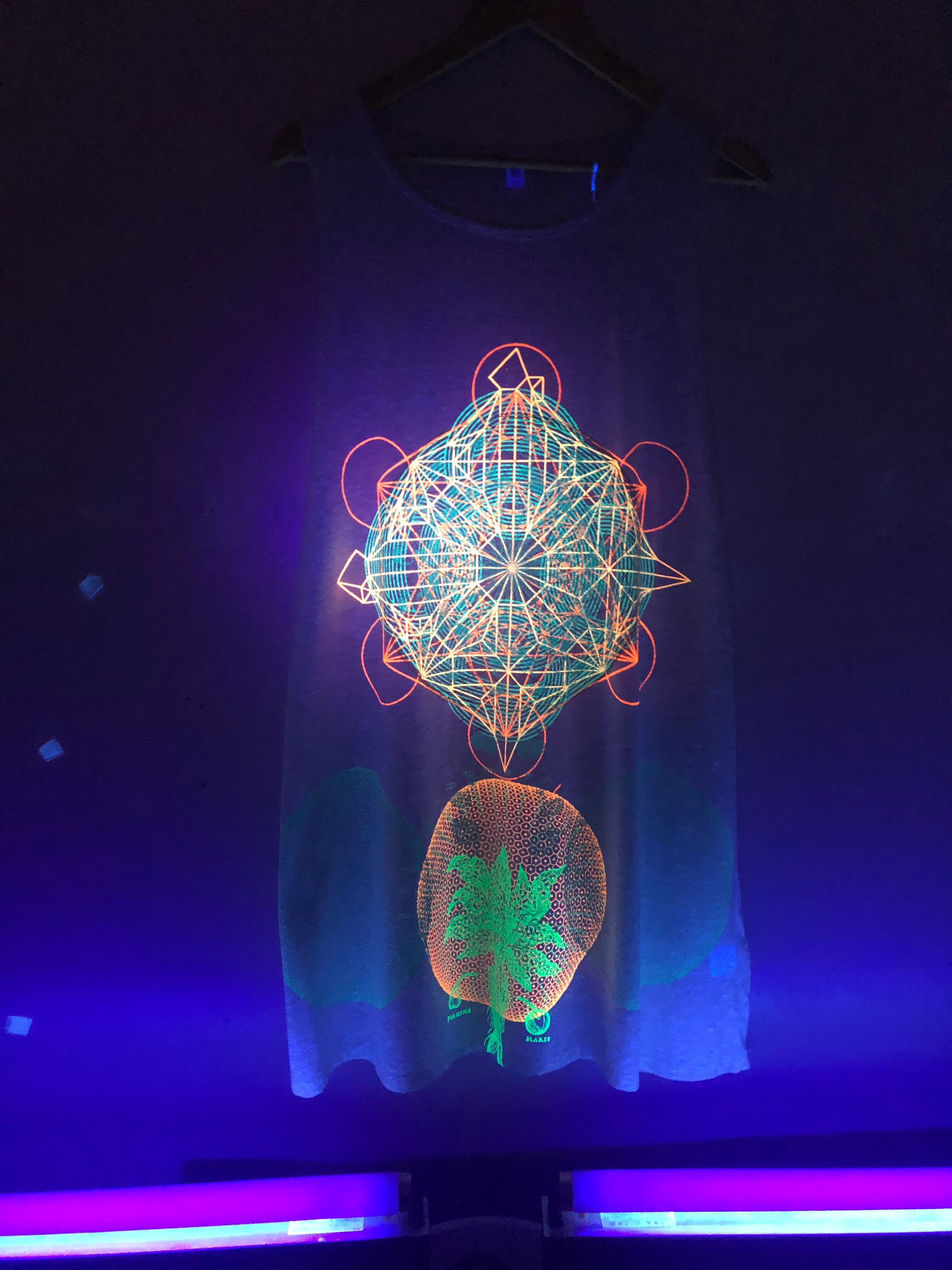ブラックライトが当たると、発光し違うデザインが浮かび上がります。