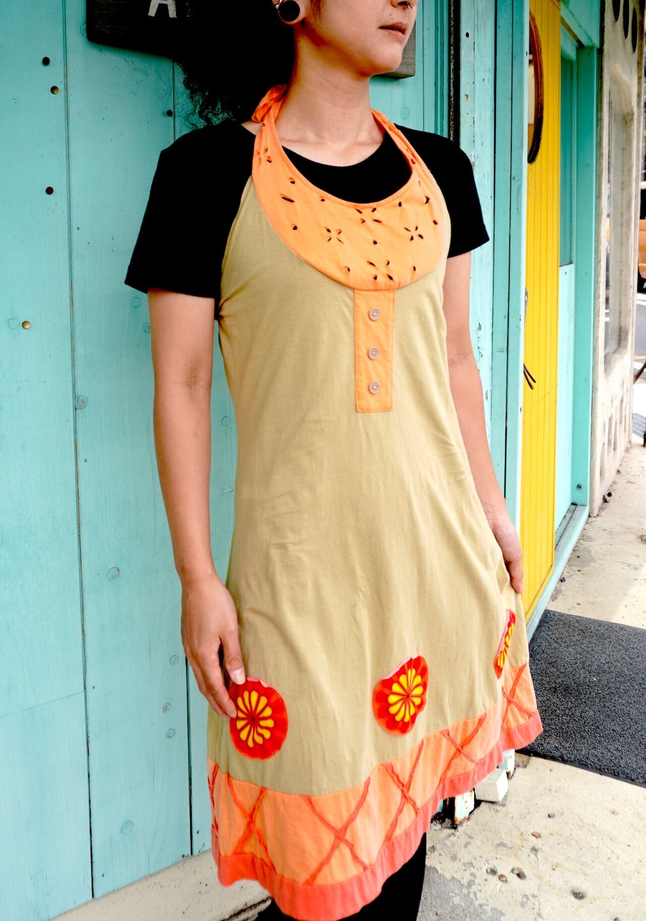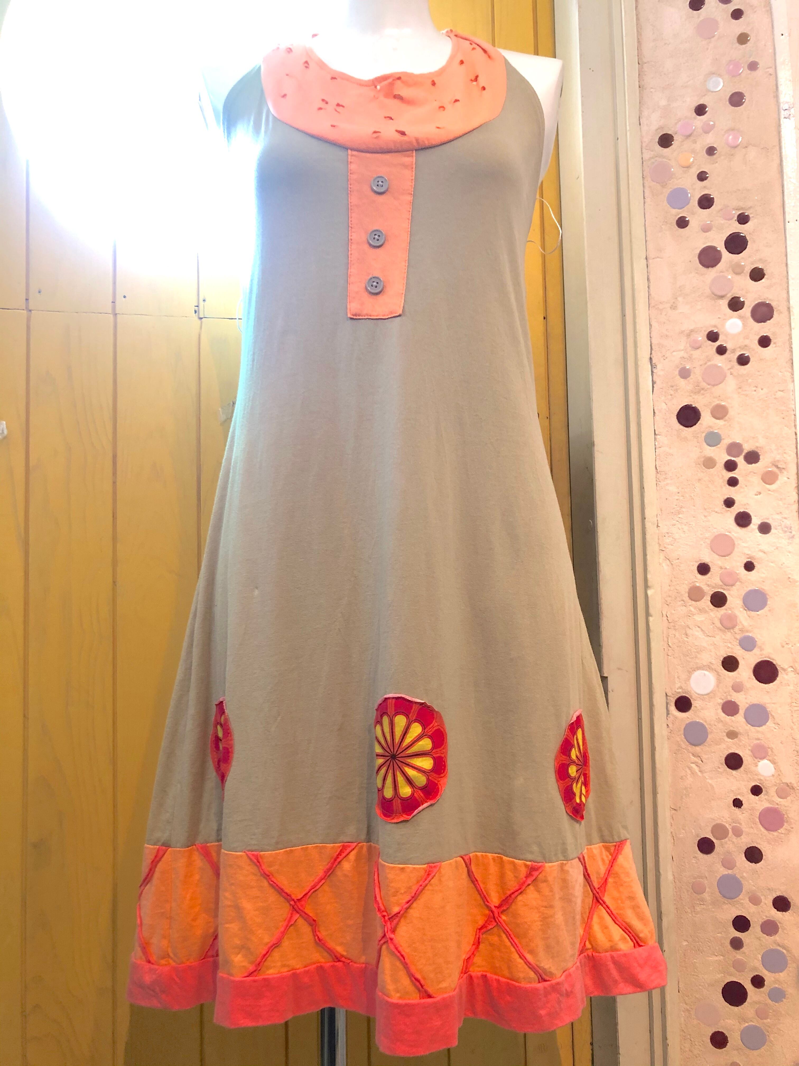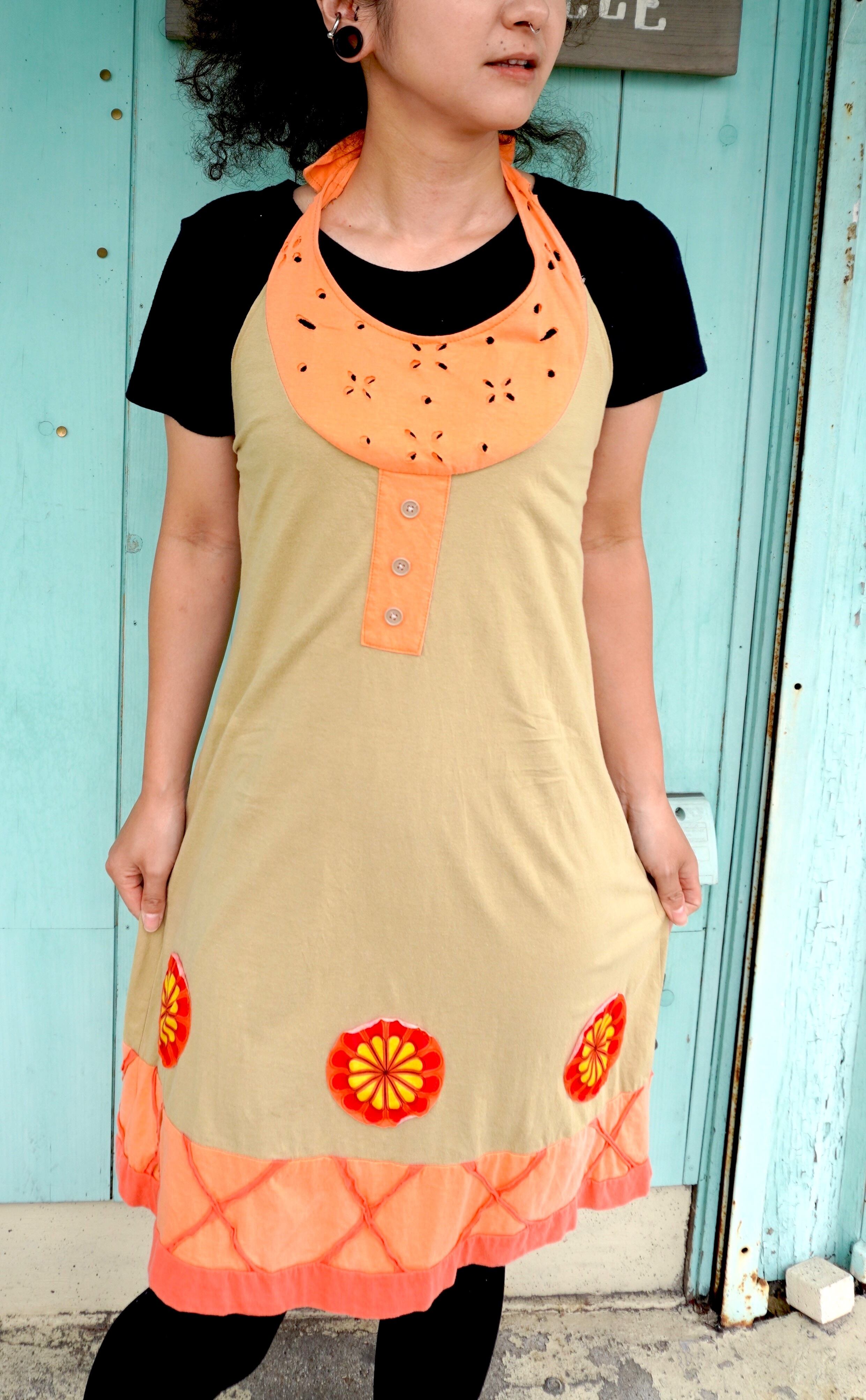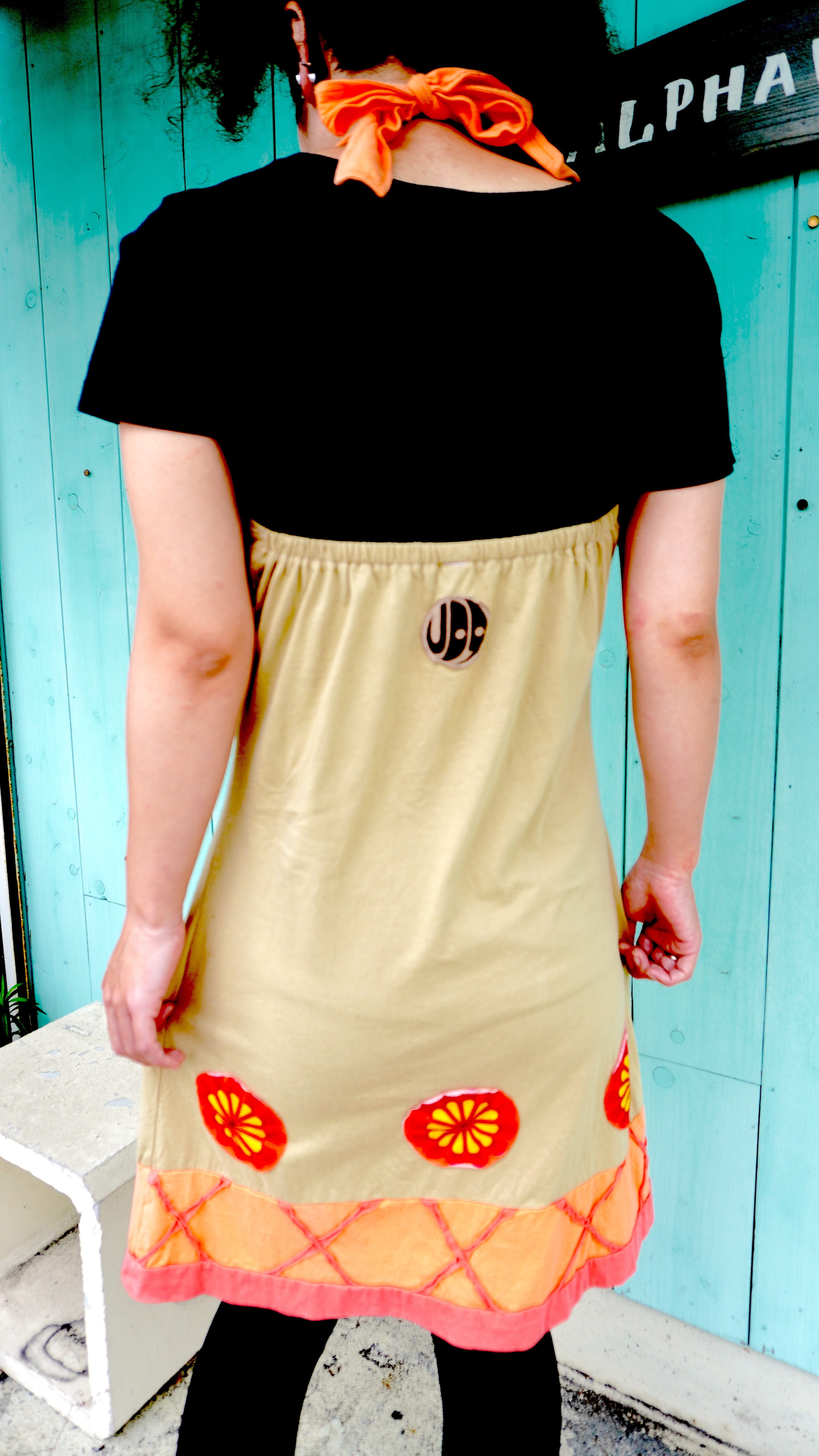 首元のオレンジの部分は生地がくり抜いてあったり、スカート部分にお花のパッチワークなどUndergroundオリジナルのデザインです。
