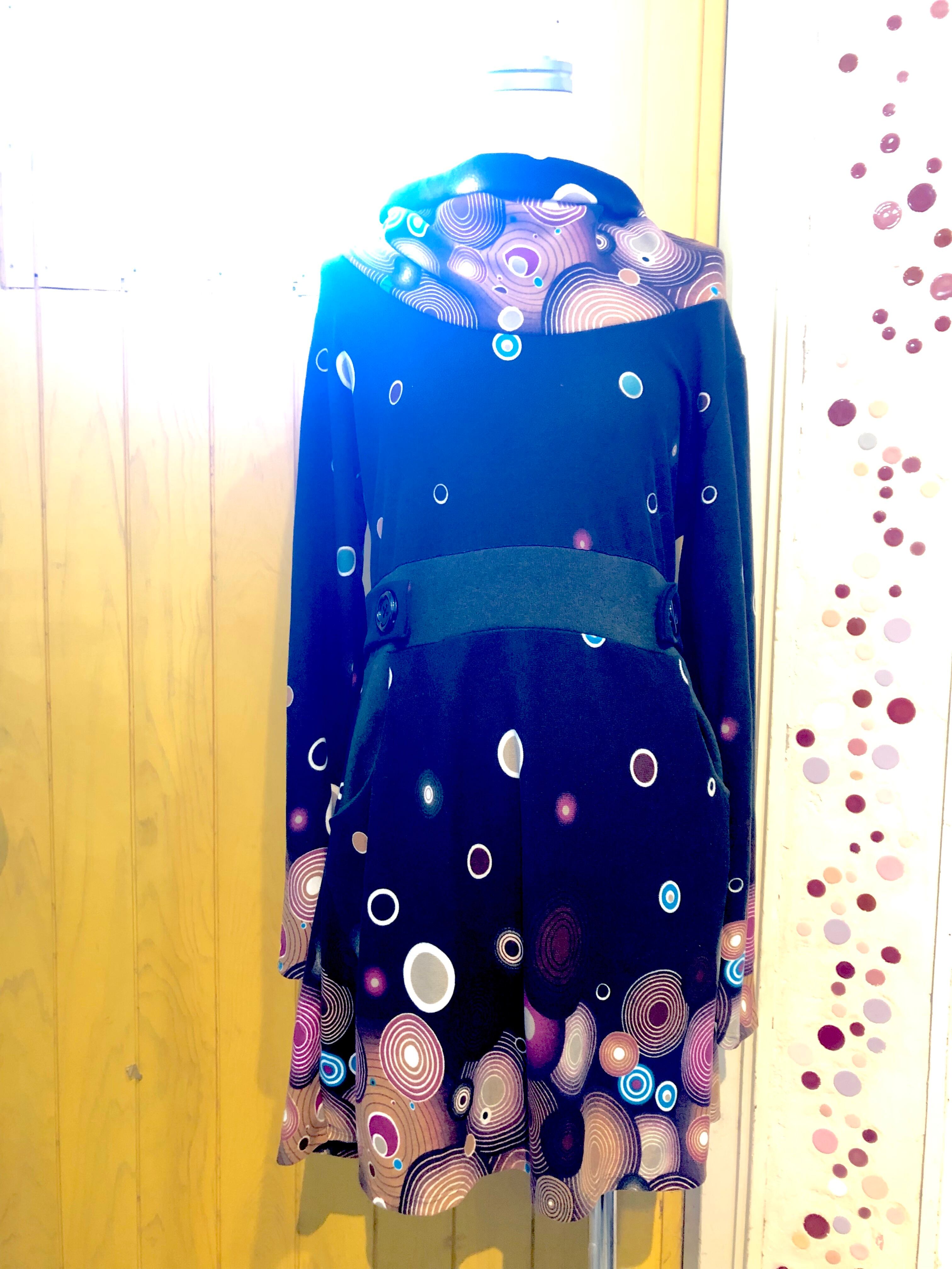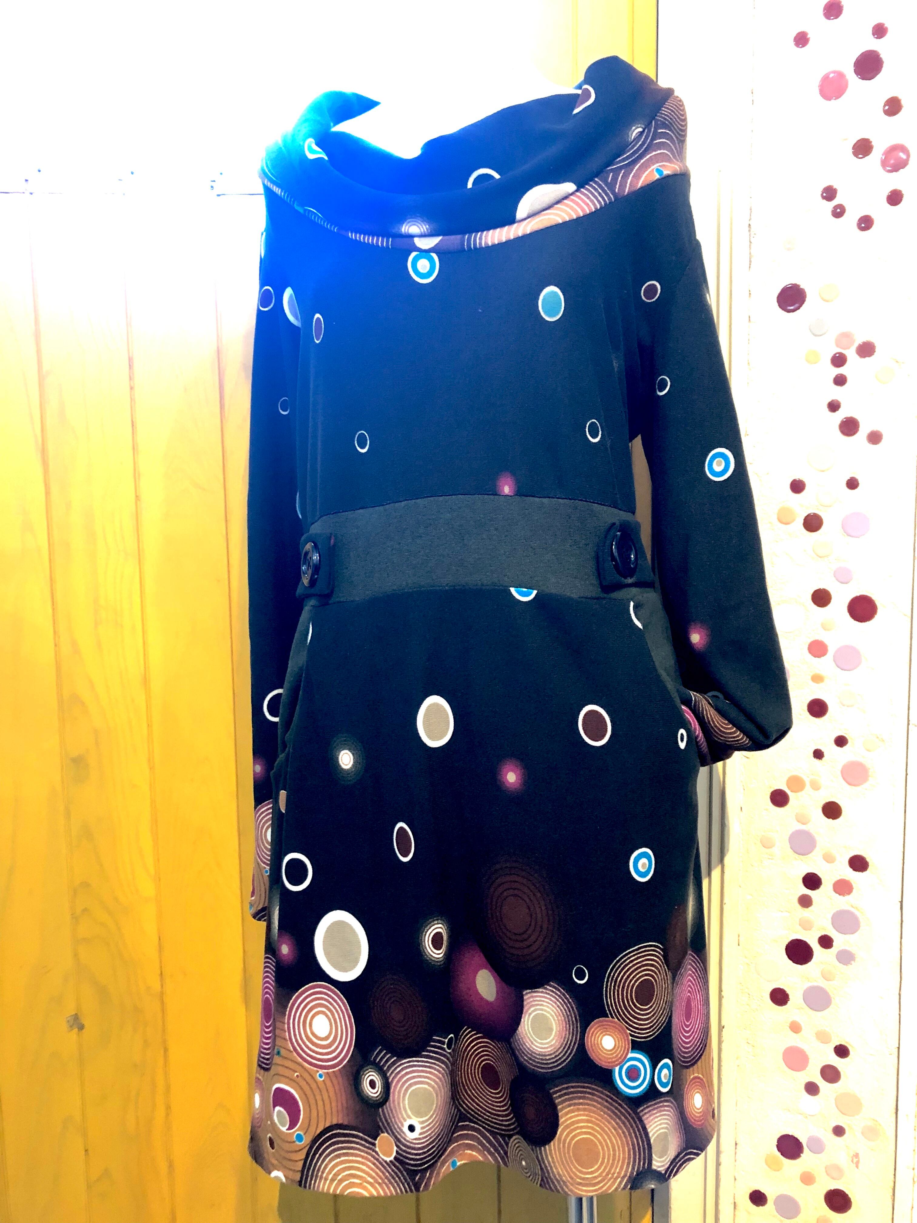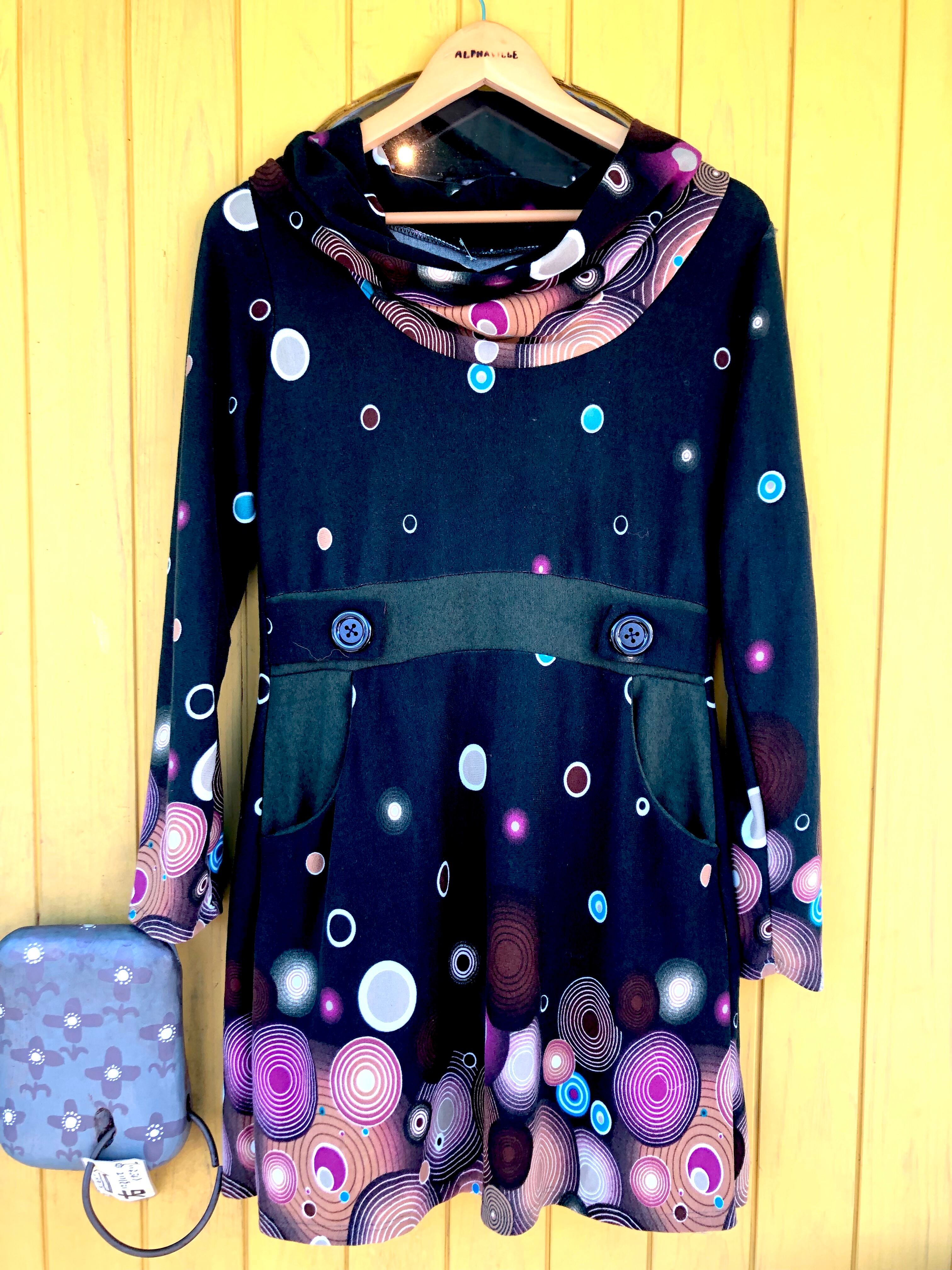 あったか長袖ワンピース レトロ柄 黒色